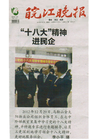2013年1月2日的《皖江晚報》上就金太陽物業(yè)組織學習十八大精神輔導主題會進行了報道,報道中說:2012年12月29日,馬鞍山市金太陽物業(yè)公司組織全體員工,在七中階梯教室里集中學習黨的十八大精神,并特邀專家進行專題輔導,讓員工更深刻地學習領會十八大精神,更好地服務社會。